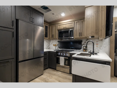 This fifth wheel has everything and then some! The front private bedroom has a queen bed slide with an optional king bed that can replace it and a front wardrobe with washer and dryer prep. Freshen up each morning in the full bathroom featuring a shower with a seat then head to the rear kitchen and scramble up some eggs on the three burner cooktop. You can enjoy your morning coffee and eggs at the 39" dinette. In the middle living area there is a 60" theater seat across from an entertainment center with a fireplace and opposing hide-a-bed sofa slides. You can even a cook outside on the outdoor griddle underneath the 11' awning!  There is a second 13' awning over the Solid Step entry and pass-thru storage area.