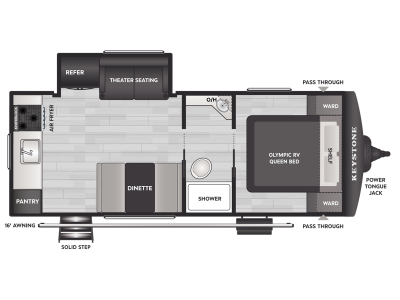 This travel trailer offers a comfortable layout! The rear kitchen is a chef's dream, featuring a three-burner stove, pantry, sink, and fridge - prep meals with ease. The booth dinette is perfect for dining, and the theater seating is ideal for relaxing. The walk-through bathroom is a plus, leading to the front bedroom with an Olympic RV queen bed and plenty of wardrobe space. And with double entry doors, getting in and out is a breeze. Perfect for couples or small families looking for a cozy getaway!