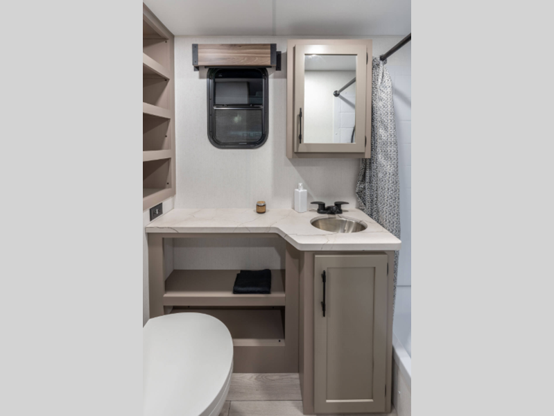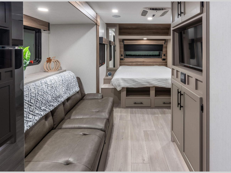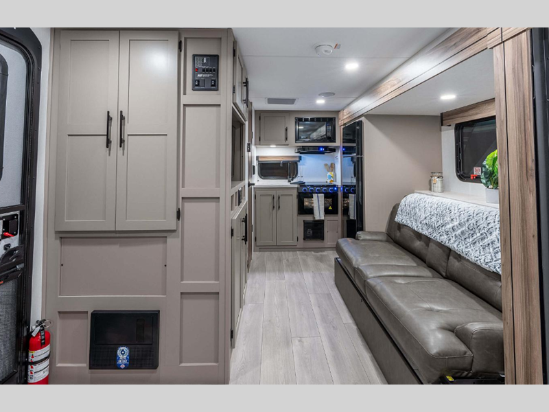 Some of the top features you'll enjoy are the molded fiberglass front cap with a windshield, the fully walkable roof with a ladder, and the exterior docking station. There is also a Key Alike program for the baggage and entry doors to keep your belongings secure plus flip-up entry steps, a Leash Latch with a bonus beverage opener, and more exterior conveniences. The seamless countertops inside will be easy to keep clean and the painted hardwood cabinet doors will make your space feel like home.