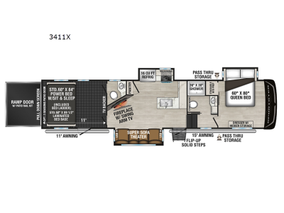 Designed with the ultimate adventurer in mind, this luxurious toy hauler fifth wheel offers the perfect blend of comfort, convenience, and fun. The front bedroom is a serene retreat, featuring a plush queen bed and a dresser with hidden storage for all your valuables. The full bathroom is a spacious oasis, complete with a generous 30” x 36” shower. The kitchen/living room is the heart of the fifth wheel toy hauler, equipped with a 16 cu refrigerator, microwave, super theater sofa, pantry, entertainment center, and a convenient half bathroom. Whether you're cooking up a storm or relaxing with family and friends, this space has everything you need. The 11’ garage is the ultimate playground, featuring a power bed, with laminated bed base, and a 32" x 96" loft bed. Finally, when you're ready to take the party outside, simply open up the ramp door and enjoy the fresh air with our patio rail kit. Relax in the shade with our massive 11’ & 15’ awnings, perfect for outdoor entertaining.