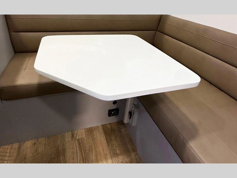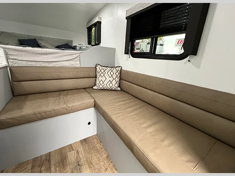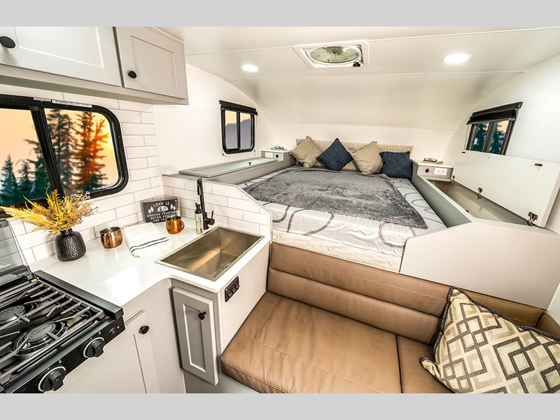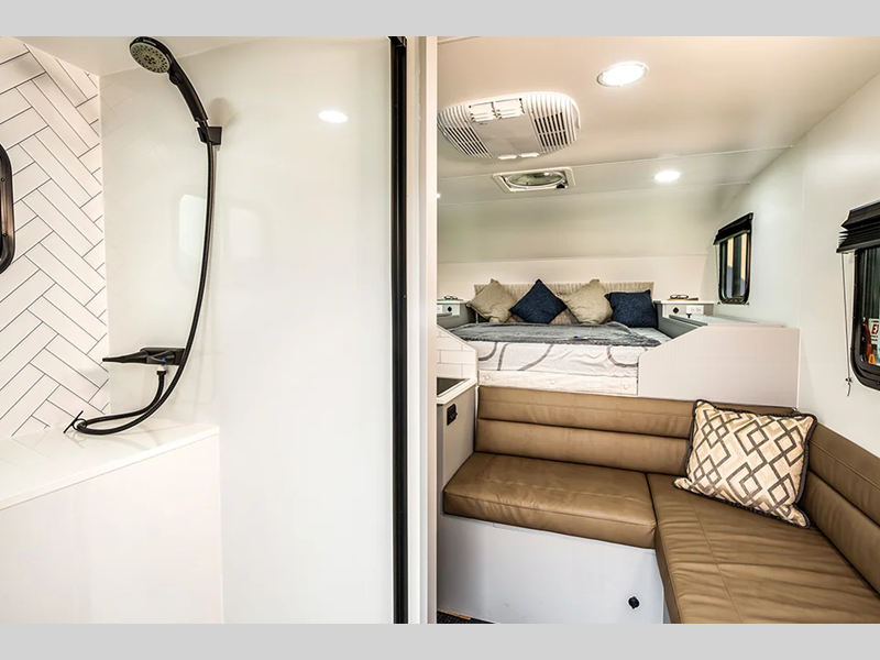 The AERIE is built with welded, tubular aluminum and composites and a fully enclosed and heated basement design, plus Truma awarded this truck camper with gold standard certification for the best insulation in its class! Inside, you'll find many comforts, including a spacious bath, convenient kitchen amenities, and comfortable seating and sleeping arrangements.